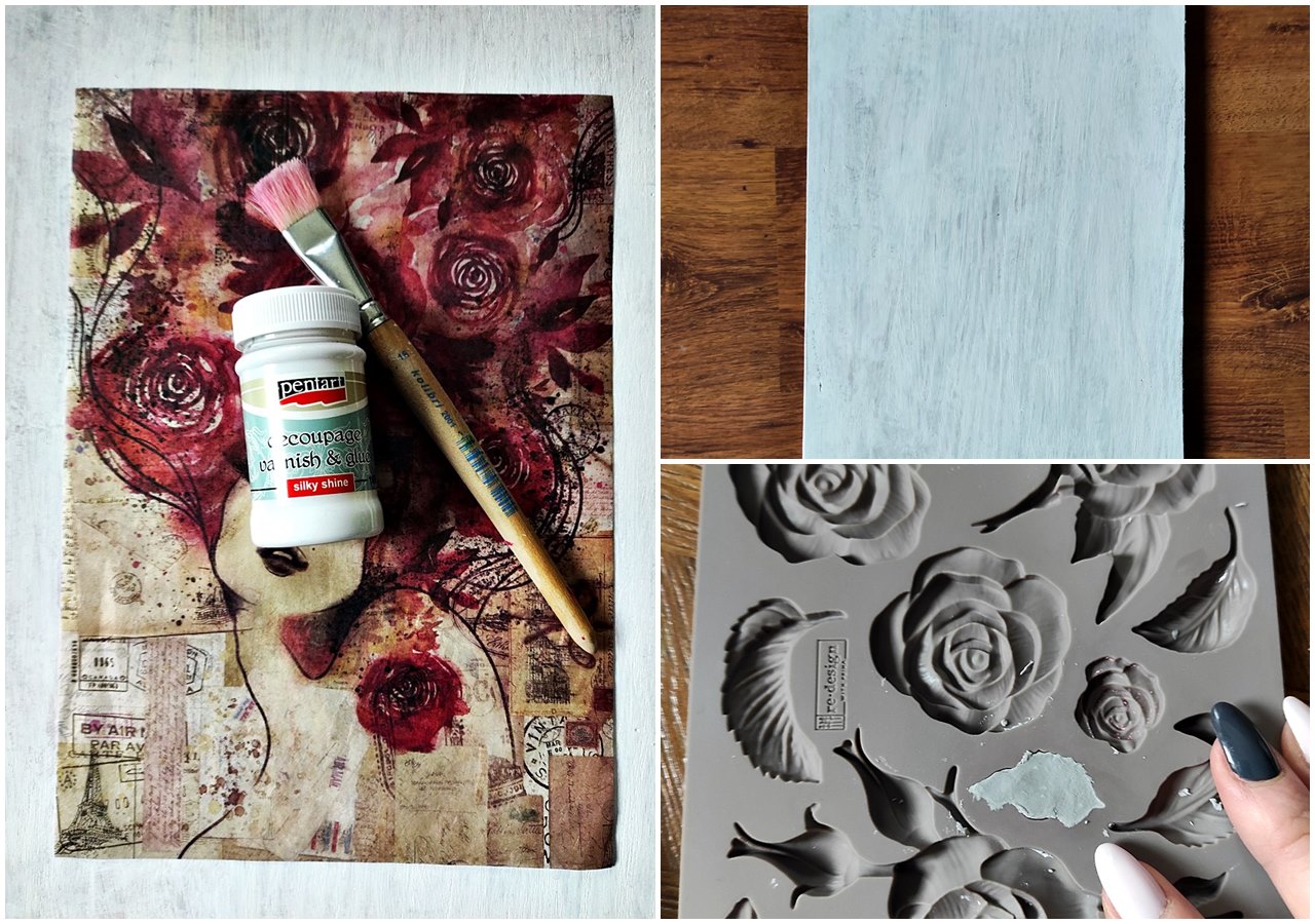 Wolną przestrzeń deski wypełniłam masą strukturalną oraz wyciskami z foremek używając masy samoutwardzalnej. Oba obrazy malowane były przy użyciu farb kredowych. Kolory, których użyłam przy obu obrazach na desce znajdziecie w sklepie Hag-Art.